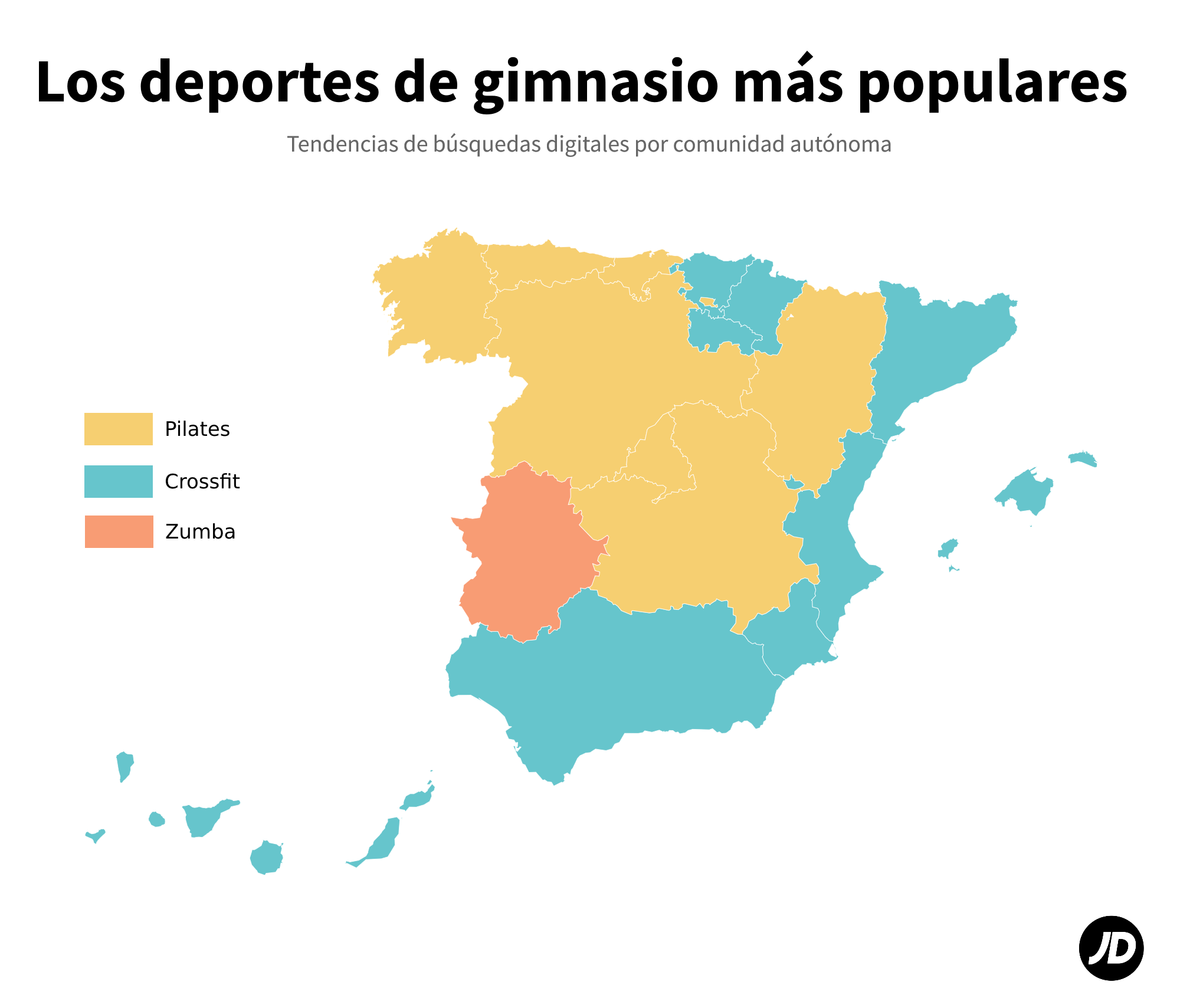 En JD Sports hemos recopilado los datos de búsquedas digitales en Google desde 2004 hasta abril de 2022 para descubrir cuál es el deporte de gimnasio más popular en cada comunidad autónoma de España. ¿Tienes curiosidad por saber la disciplina que más interesa en tu región? Aquí va el mapa: