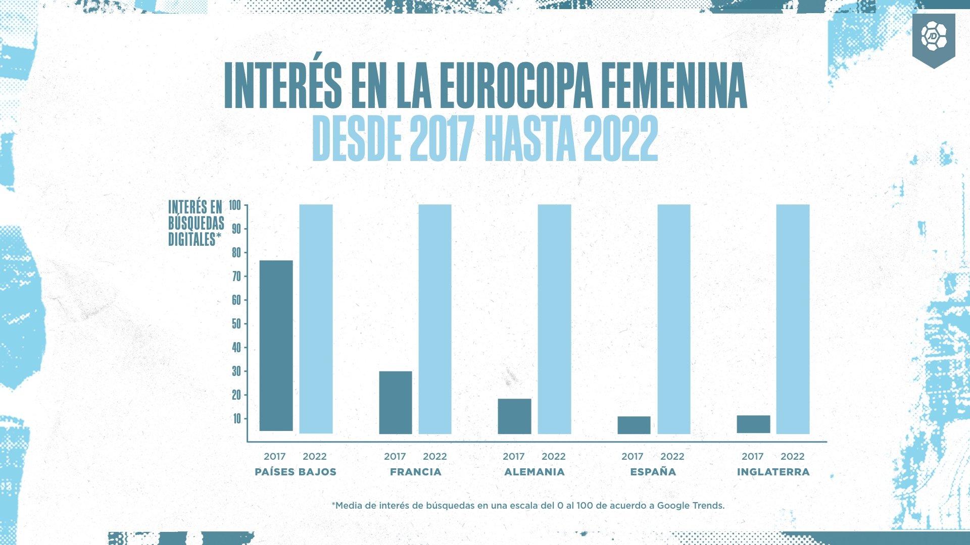 En 2022, las tendencias de búsquedas han crecido de forma notable entre un 200 % y un 800 %. La gente ha estado siguiendo activamente la competición, más que nunca. Claramente, Inglaterra es el país con un mayor crecimiento en este aspecto, sin duda influenciado por ser el país anfitrión y ganador de la Eurocopa femenina.