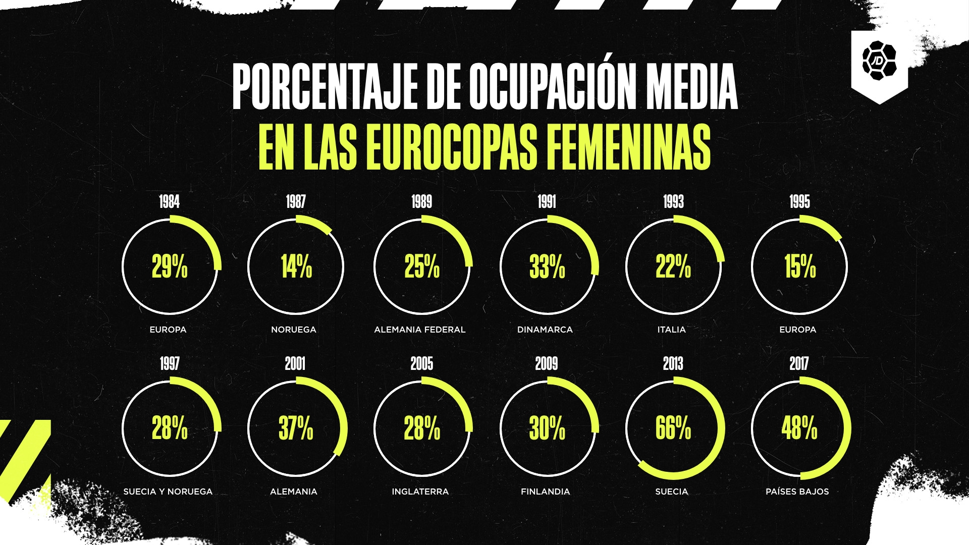 Por esta razón, es más justo analizar en su lugar el porcentaje de ocupación de los estadios, ya que tiene en cuenta el número de personas de acuerdo a la capacidad del estadio. Como se puede ver en la imagen, la primera Eurocopa Femenina tuvo una media de ocupación del 29 %. 33 años después, la cifra ha subido a un 48 %. Pese a que a primera vista pueda no parecer un crecimiento muy destacable, se puede ver que desde principios de la década de los 2000 ha habido un gran paso adelante en la competición.