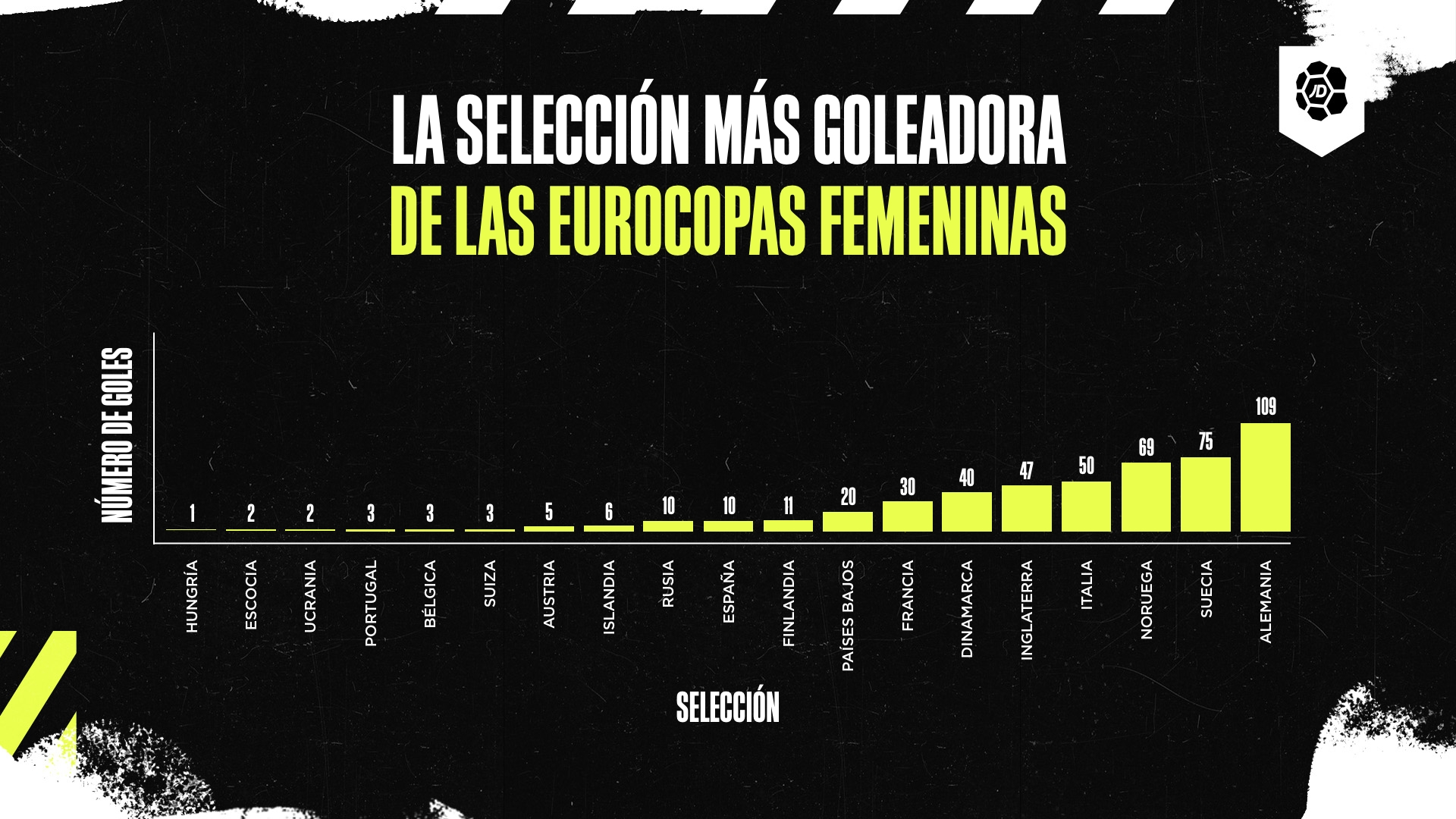 Si nos fijamos ahora en la gráfica, veremos el número de goles totales marcados por cada selección de fútbol durante todas las ediciones de la Eurocopa Femenina. Alemania es la mayor goleadora con 109 en un total de 48 partidos y una media de 2,27 goles por partido.